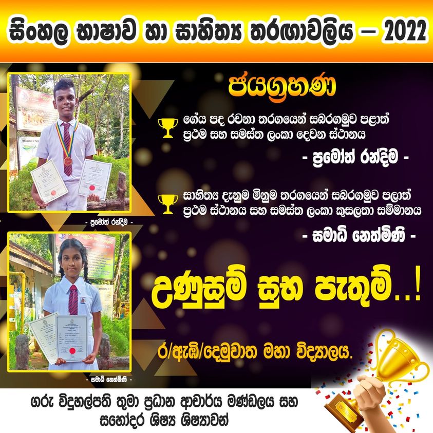 08 Sep2023 නර්තන ජයග්රහණ සබරගමුවේ දෙවන තැන දෙමුවාත විද්යාලයට...... පහතරට භාවාදීතාලය සිංදු වන්නම(සමූහ) සහ උකුසා චරිතය නිරූපණය(ඒකල) තරග වලින් ජය ලැබූ අපේ දරුවෝ සහ එම දරුවන්ට නිවැරදි මග පෙන්වන අපේම ගුරුභවතුන්....... ඇඹිලිපිටිය කලාපයේ කේවල සහ සමූහ නර්තන තරගාවලියෙන් දෙමුවාත විද්යාලයට පළමු තැන...... ඊයේ පාසල් නිවාඩු දුන්නේය. නමුත් අද දින අප පාසලේ නර්තන විෂය භාර ගුරු භවතුන් වන ගයනි පරණයාපා ගුරුතුමිය මලීෂා ගුරුතුමිය අයේෂා ගුරුතුමිය අප පාසලේ කුසලතාදී ශිෂ්යාවන් නර්තන තරග සදහා ඇඹිලිපිටිය ජාතික පාසලට කැදවාගෙන ගියේ තවත් ජයග්රහණයකින් දෙමුවාත විදු මාතාව සරසවන්නටය. එය වචනයේ පරිසමාප්ත අර්ථයෙන් ම සැබෑ කරමින් අද දින ඉදිරිපත් වූ කේවල සහ සමූහ දෙඅංශයෙන්ම ඇඹිලිපිටිය කලාපයේ පුථමයා වීම වෙනුවෙන් අප විද්යාලයේ නර්තන තරග සදහා ඉදිරිපත් වූ සියලුම ශිෂ්යාවන් හට උණුසුම් සුභ පැතුම් එක් කරන්නේ හද පිරි සතුටෙනි. සබරගමුව පළාතේද පළමු තැන ගැනීමට ශක්තිය ධෛර්ය ලැබේවායි පුාර්ථනා කරන්නෙමු. මාධ්ය ඒකකය දෙමුවාත විද්යාලය 2023/07/22.
