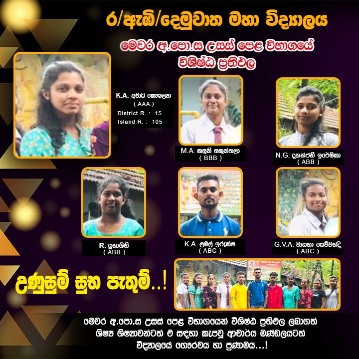 08 Sep2023 ර/ඇඹි/දෙමුවාත මහා විද්යාලයේ මෙවර අ.පො.ස. උසස් පෙළ විශිෂ්ඨ ප්රතිඵල ර/ඇඹි/දෙමුවාත මහා විද්යාලයේ මෙවර අ.පො.ස. උසස් පෙළ විශිෂ්ඨ ප්රතිඵල