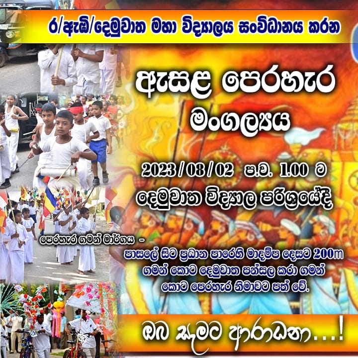 08 Sep2023 2023 ඇසළ පෙරහැර දෙමුවාත විද්යාලයේ ඇසළ පෙරහැර අති සාර්ථකව අවසන් විය.......... දෙමුවාත විද්යාලයේ හරි පුදුම ස්කෝලයකි. ටොට්ටෝ චංලාට කදිම තෝතැන්තකි. මක් නිසාද යත් මෙහි ගරු විදුහල්පති තුමා දරුවන්ගේ දැනුම කුසලතා ආකල්ප වැඩි දියුණු කරන්නට පන්ති කාමරයේ අධ්යාපනය සේම විෂය බාහිර කුියාකාරකම් පිළිබඳව ද දැඩි උනන්දුවෙන් පසු වන බැවිනි. ඇසළ පෙරහැර මංගල්යය ද එලෙස දියත් වූ වැදගත් වැඩසටහනකි. මේ සදහා අපට බොහෝ දෙනෙකු උදව් කළේ පුදුමාකාර උනන්දුවකිනි.ඒ සියලු දෙනාම මතක් කරලීම අපගේ යුතුකමකි.ඒ අතර 01.අමරපුර නිකායේ ඉද්දමල්ගොඩ පාර්ශවයේ රත්නපුර දිසාවේ අධිකරණ සංඝනායක දෙමුවාත ශාන්ති නිඛේතනාරාමය පන්නිල බුදු ගල්ලෙන චන්දුාරාම විහාරයන්හි උභය විහාරාධිපති පූජ්ය ගොඩැල්ලේ නායක හාමුදුරුවන් වහන්සේ. 02. කහවත්ත ශාසනාරක්ෂක බල මණ්ඩලයේ නියෝජ්ය ලේඛකාධිකාරී පන්නිල ශාන්ති නිඛේතනාරාමාධිකාරී මුළු දිවයිනටම සාමවිනිසුරු පූජ්ය පන්නිල රතනසාර ස්වාමීන් වහන්සේ. 03. රාවණා ලංකා මාධ්ය ජාලයේ ගරු සභාපති නිශ්ශංක මායාදුන්නේ මහතා 04. ගොඩකවෙල පුාදේශීය සභාවේ හිටපු ගරු සභාපති පුියන්ත බණ්ඩාර මහතා 05.රක්වාන පොලිස් ස්ථානයේ පොලිස් ස්ථානාධිපතිතුමා පුමුඛ රථවාහන අංශයේ පොලිස් නිලධාරීන්. 06. අප පාසලේ ආදි ශිෂ්ය සජබ කොට්ඨාස සංවිධායක දුමින්ද මහතා. 07.පැල්මඩුල්ල තේනු කුියේෂන්ස් ආයතනයේ අධිපතිතුමන් 08. අලුත් පාර චමින්ද මහතා. 09. අලුත් පාර සමෘද්ධි සමිතියේ නිලධාරිනී නන්දනි මහත්මිය. 10. අලුත් පාර රංග මහතා. 11. තැපැල් දෙපාර්තමේන්තුවේ සේවයේ නියුතු හොරමුල උපාලි මහතා. මේ අනුව අප පාසල තුළ කුියාත්මක කරන ලද 2023 අගෝස්තු මස 02 වන දින ඇසළ පෙරහැර මංගල්යය ගරු විදුහල්පති තුමාගේ උපදෙස් පරිදි ගරු නියෝජ්ය විදුහල්පති තුමියගේ පූර්ණ අධීක්ෂණය යටතේ පුාථමික හා ද්විතීයික පන්ති භාර,විශේෂ පන්ති භාර, විෂය භාර ගුරු භවතුන් සේම සංවර්ධන නිලධාරී මහත්ම මහත්මීන්ගේ පූර්ණ කැපවීමෙන් ද අප පාසලේ ආදරණීය දු දරුවන්ගේ දෙමාපියන්ගේ කැපවීමෙන් ද ආදි ශිෂ්ය ශිෂ්යාවන්ගේ සහ සම්බන්ධයෙන්ද ශිෂ්ය ශිෂ්යාවන්ද නන් අයුරින් පෙරහැර සදහා සිදු කළ සහභාගිත්වය මත දෙමුවාත විද්යාලයේ ඇසළ පෙරහැර මංගල්යය නිමා වූයේ සැම දෙනාටම ලබන වසරේත් මෙවැනි පෙරහැරක් සිදු කිරීමේ ස්ථිර අධිෂ්ඨානයෙනි.සැමට තෙරුවන් සරණයි. මාධ්ය ඒකකය ර/ඇඹි/දෙමුවාත මහා විද්යාලය දෙමුවාත